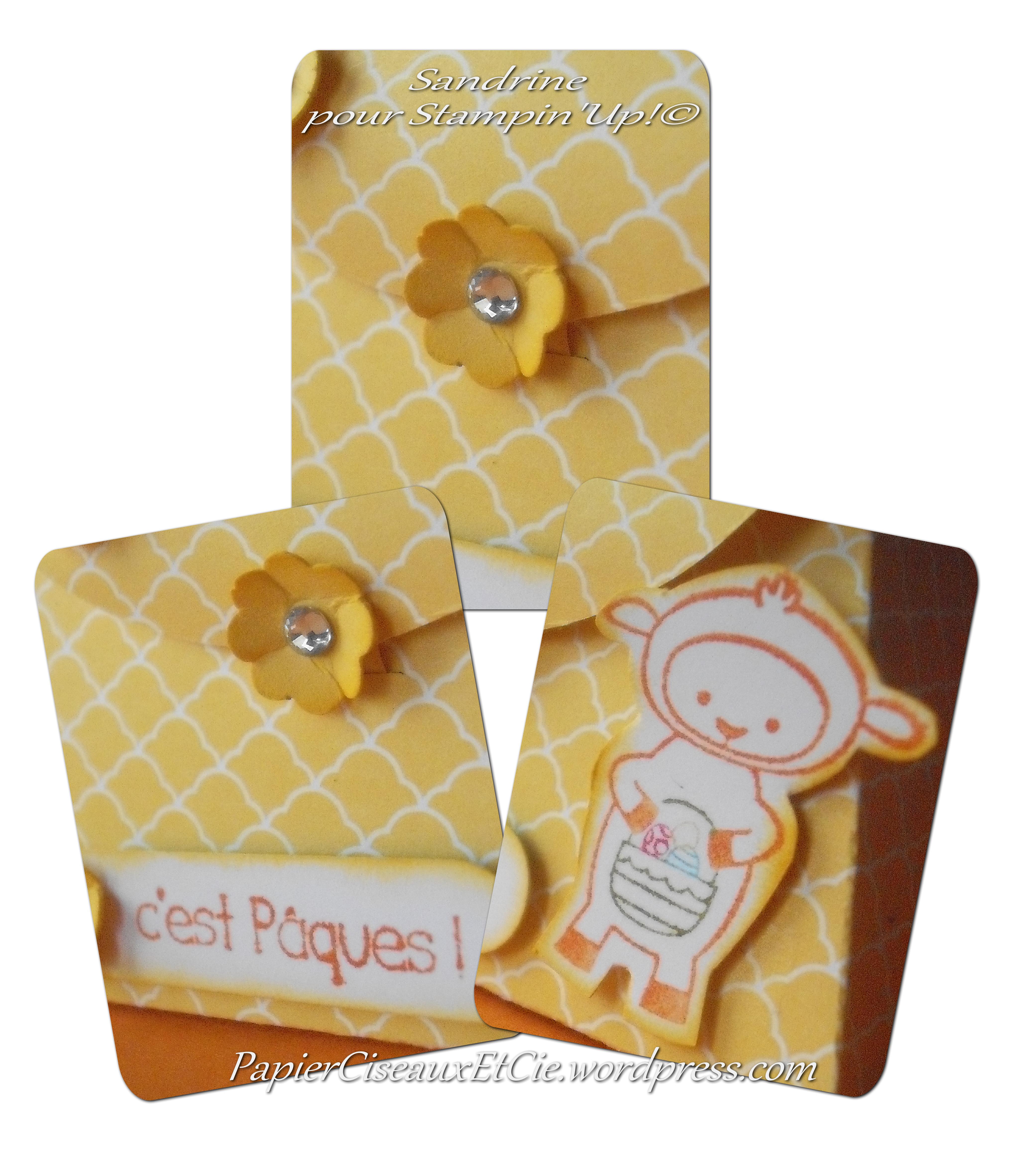 Je l’ai réalisé avec la découpe BigzL « Mini Sac à main » dans du papier à motif de la serie design collection « Brillants » et du jaune « narcisse délice », avec le set de tampons presque du même nom (ils étaient fait pour se marier!) « Délices de Pâques ».