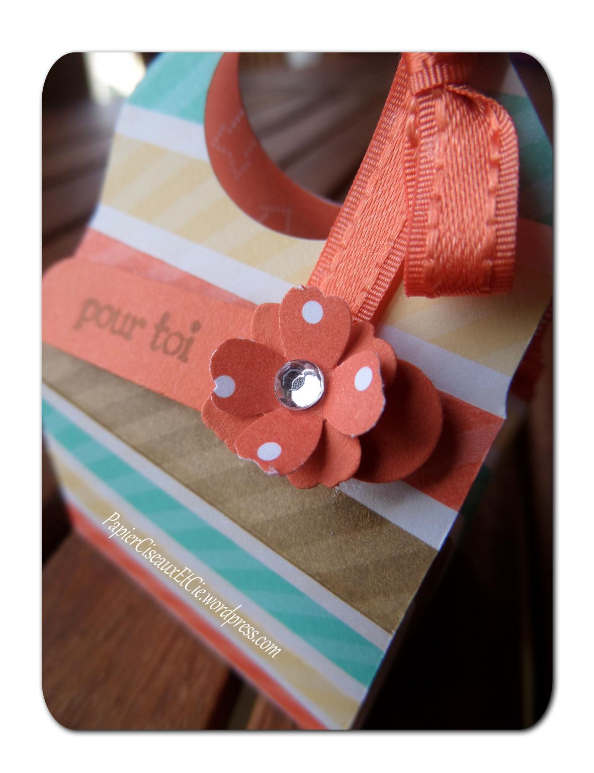 J’ai fait ce petit sac avec l’insta’enveloppe, les perfo: fenêtre pour texte et mini-décoration, le set de tampons « Voeux mignon », du papier venant du journal « fraîche nostalgie » et de la serie design collection de couleur et enfin un bijou cristal.
