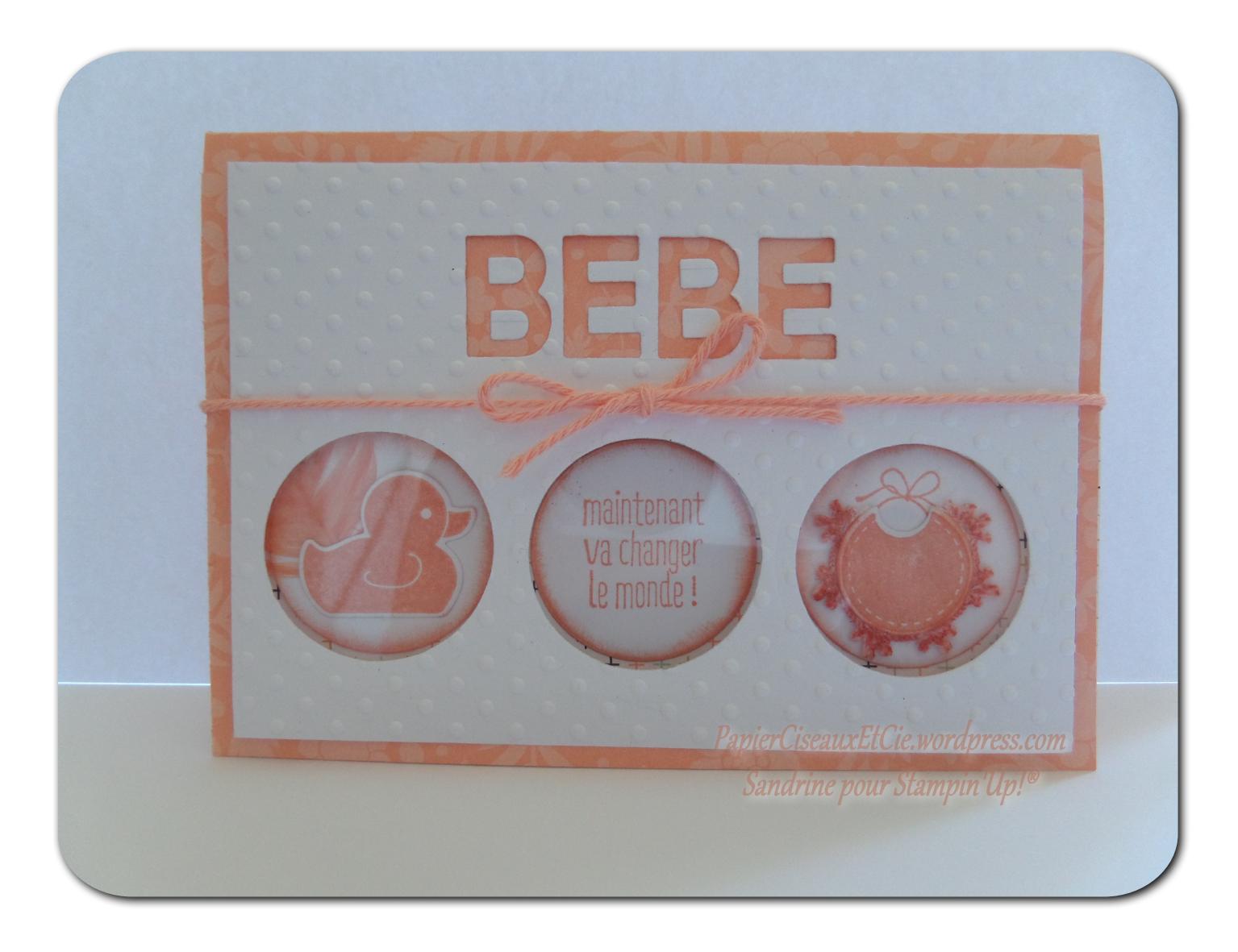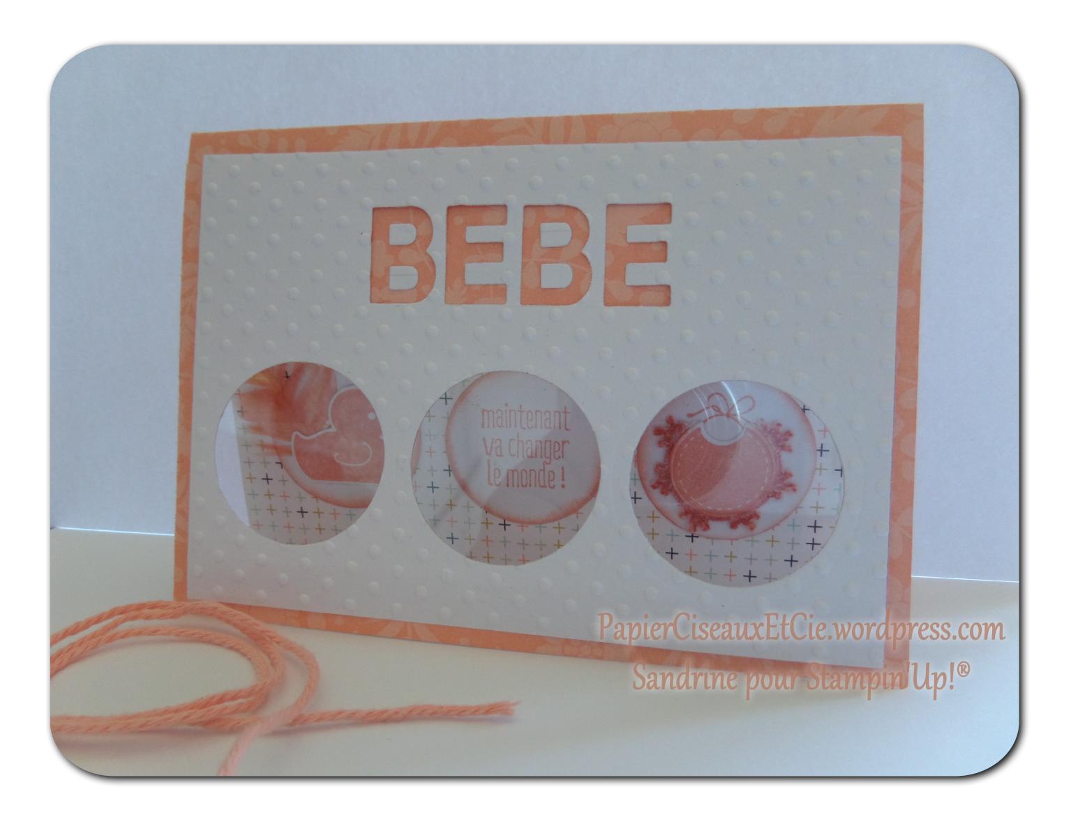 Cette fois je vous propose une carte dont l’inspiration me vient du set de tampons et sa découpe « Something for baby » , des thinlits lettres et d’une discution avec d’Anna-Maria ( 😉 ) sur le papier fenêtré.