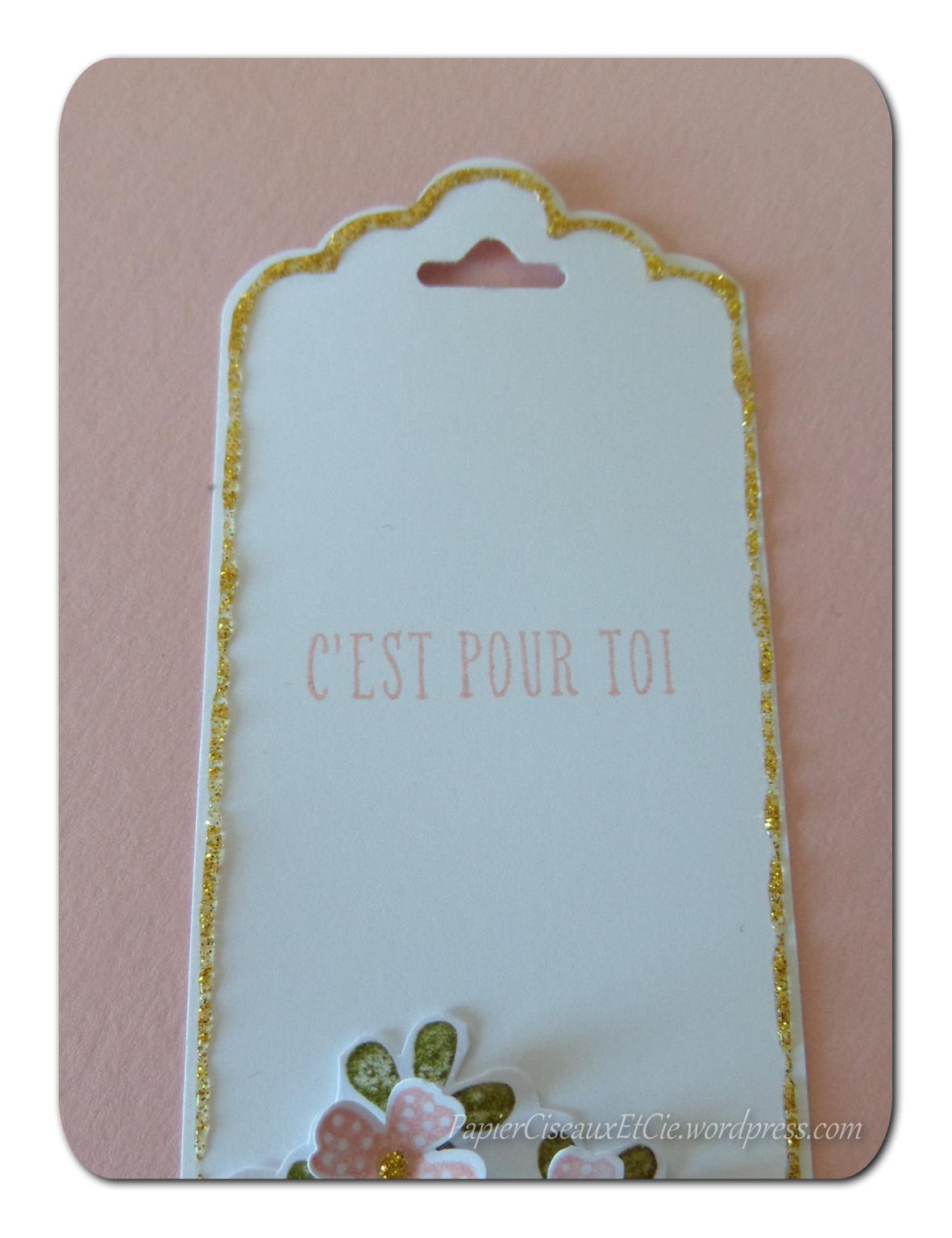 j’ai créé ce petit tag en utilisant le set de tampon « Fou de toi » exclusivement dédié aux hôtesses (c’est un des nombreux avantages à me recevoir chez vous 😉 à ce propos vous pouvez lire > ceci <), le message vient du set de tampons « Du coq à l’âne », les fleurs ont été réalisées grâce au set « Quelque chose à dire » et à la perforatrice du lot mini-décoration et enfin la bordure a été faite avec le gel pailleté « pluie irisée or »