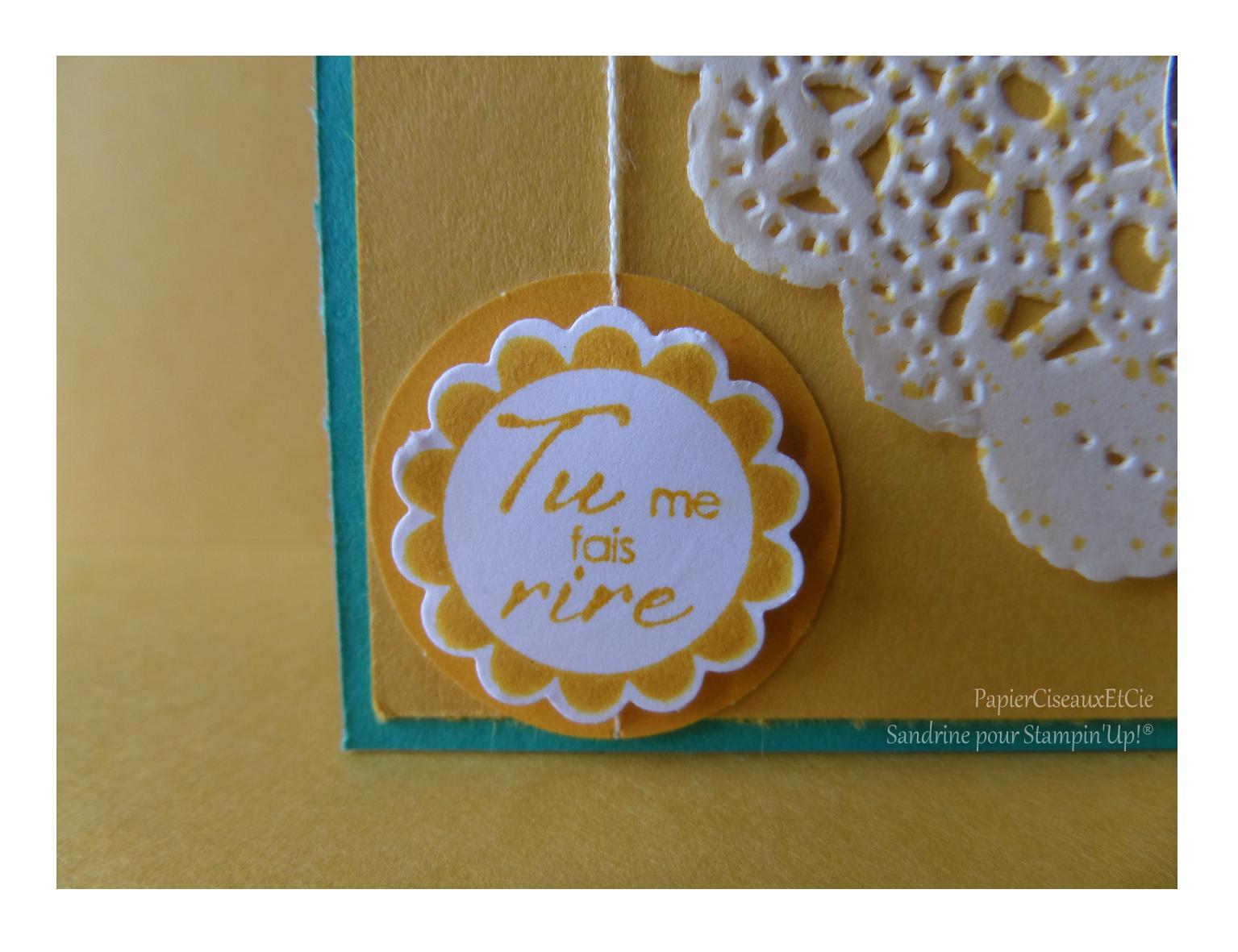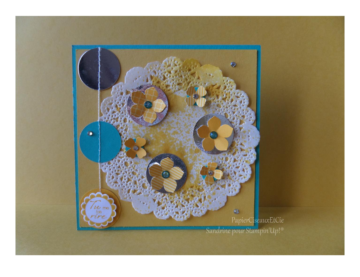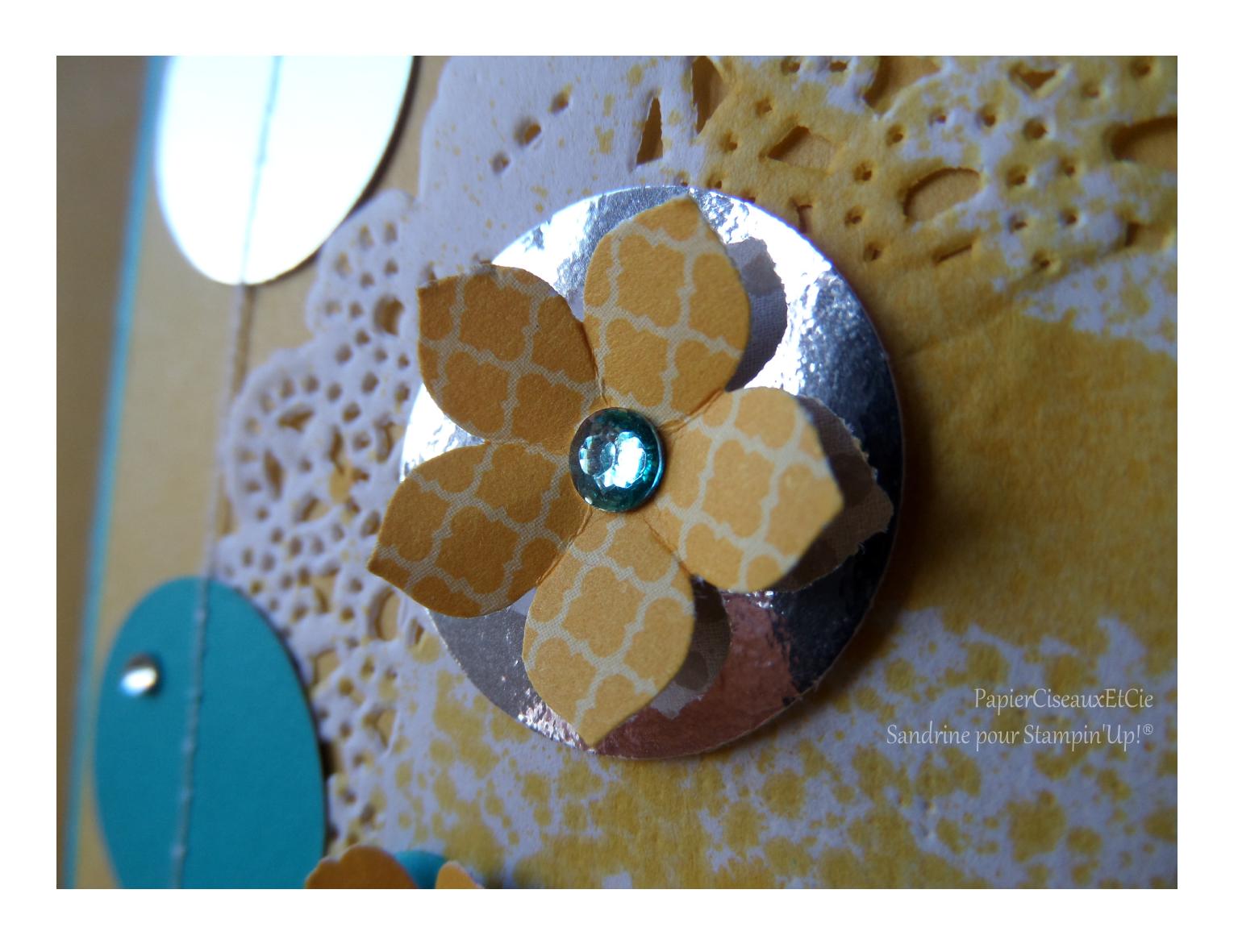 Pour réaliser cette carte j’ai utilisé: un napperon, des accéssoires (dont le papier à motif) du « kit Fête parfaite carry moulu », la perforatrice « Ellebore » et celle à fleur de « Mini Décorations », les mariabilités bleu copacabana (couleur foncée), le tampon issus du set « Médaillons séduction » du papeir baie des bermudes et carry moulu 🙂