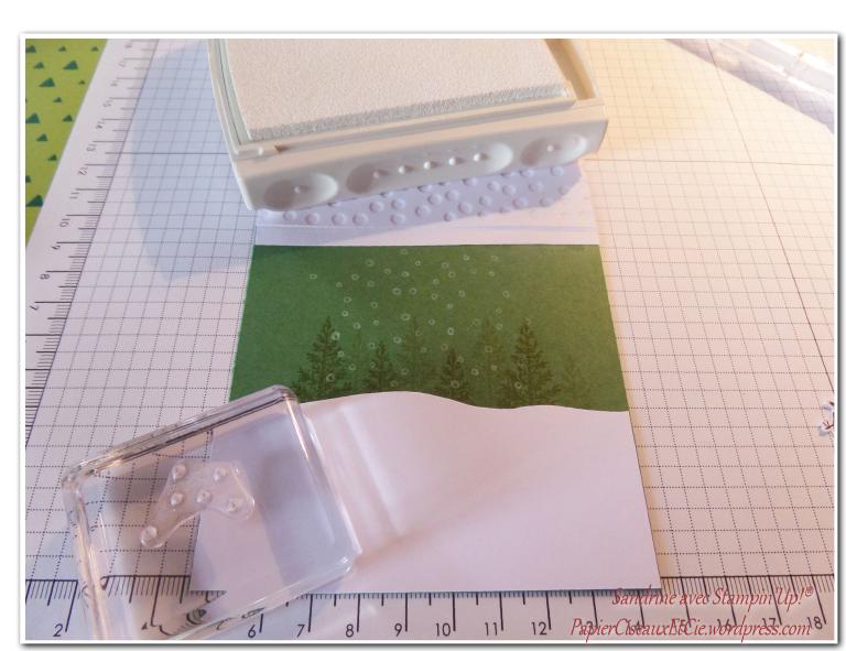 Avec les flocons du set de tampons Noel blanc, faites tomber quelques flocons sur les arbres avec l’encre Murmure blancSwap 7