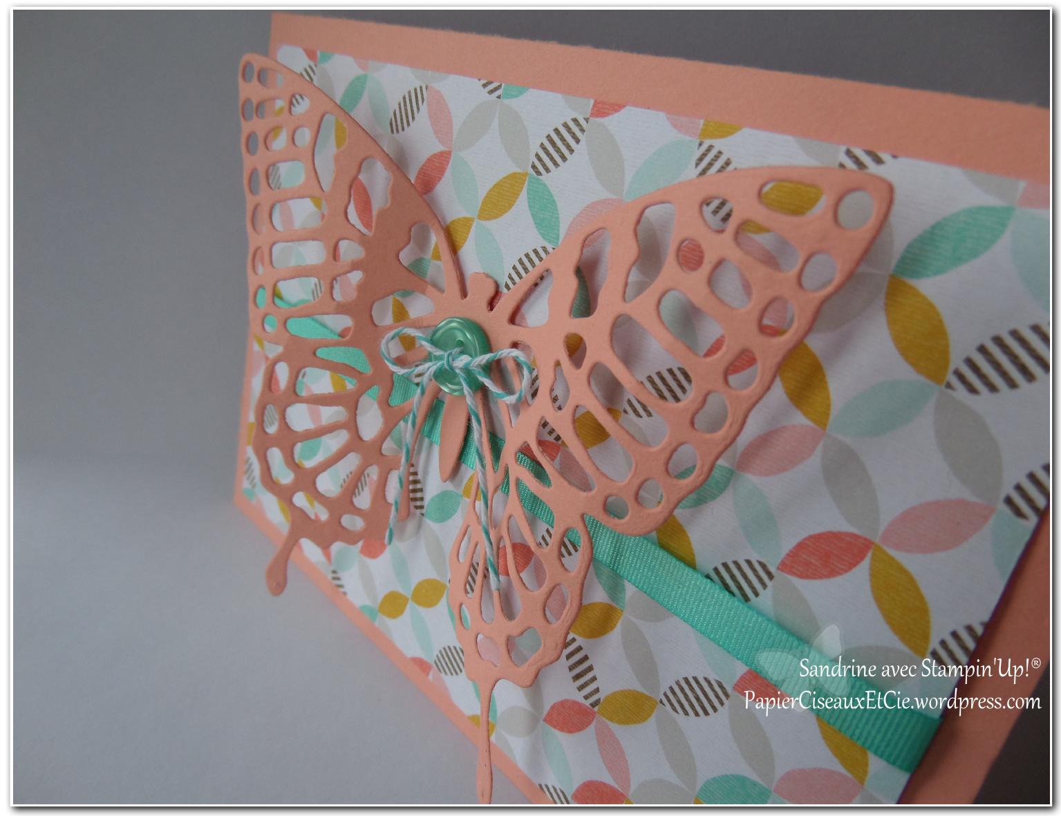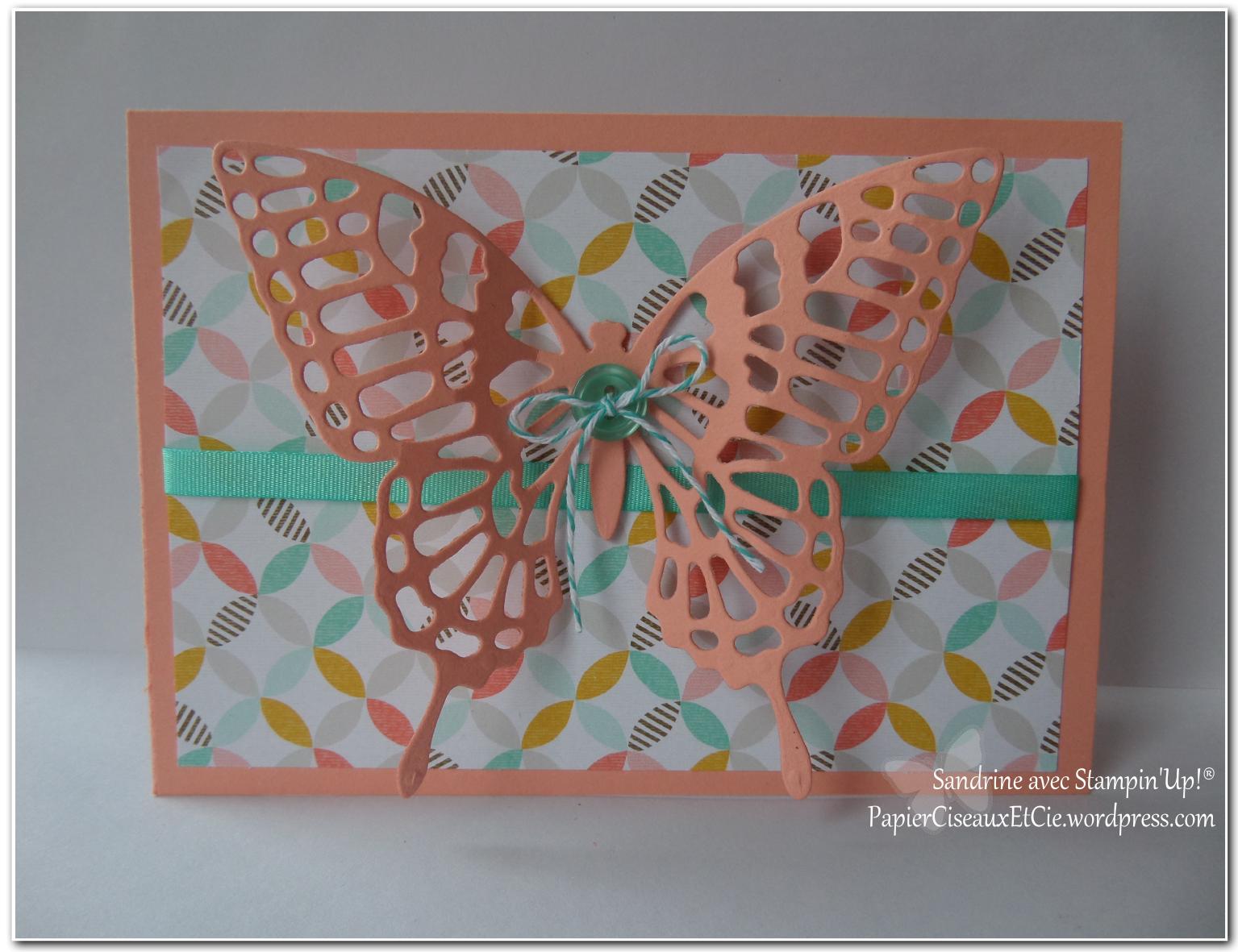 Elle a utilisé les papiers et le lot d’accéssoires (ruban et bouton) offerts pendant Sale-a-bration.