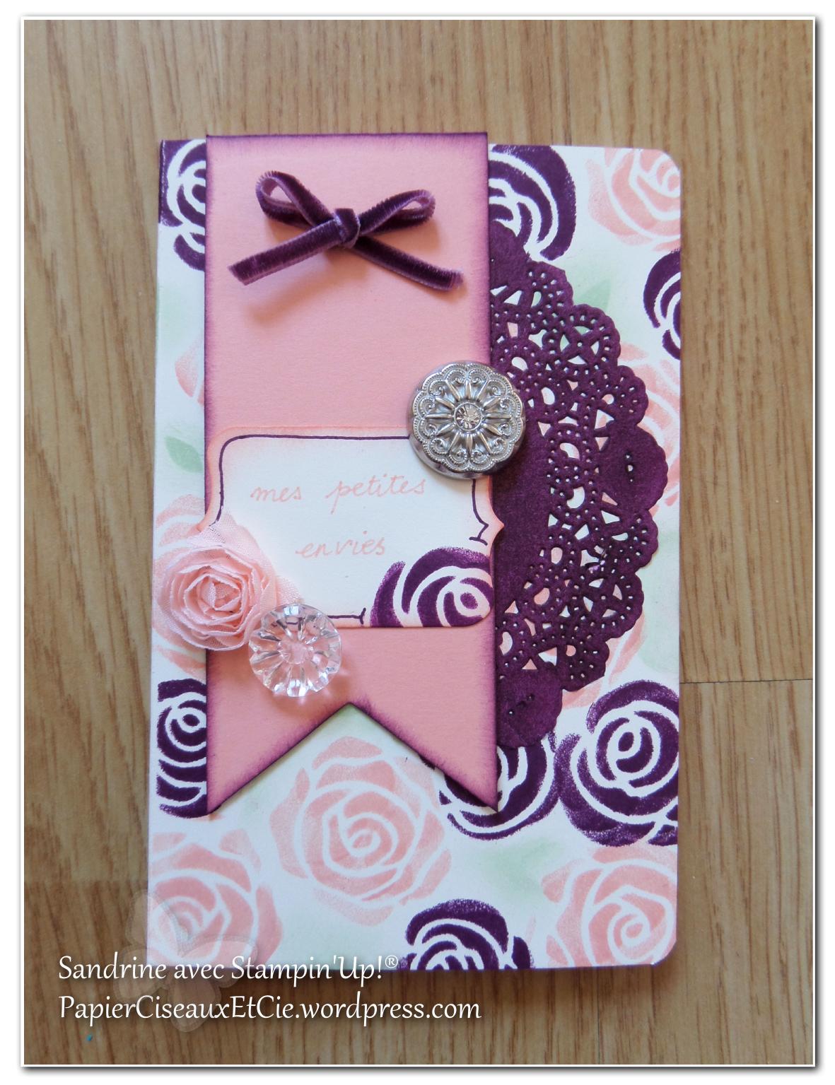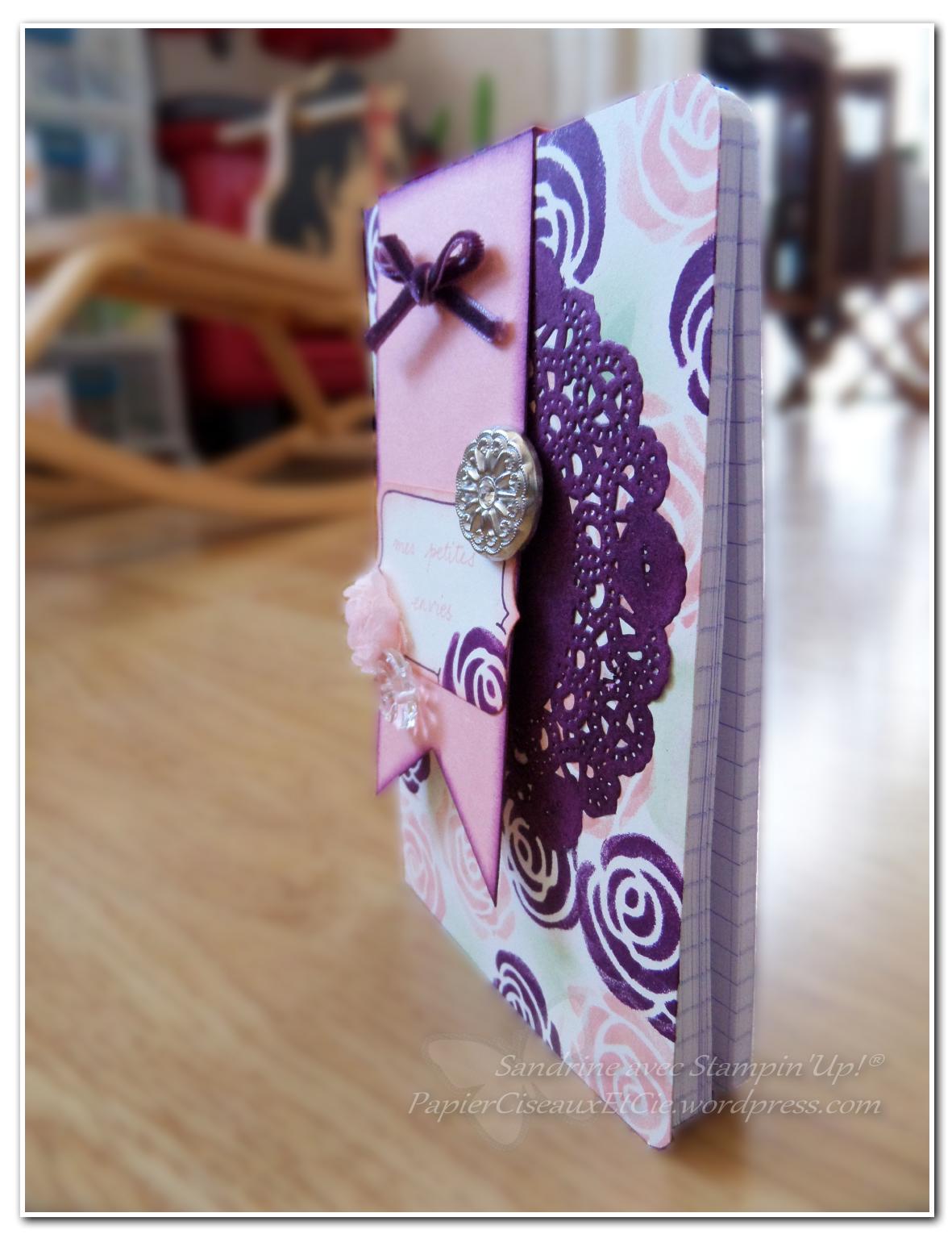 il s’agit d’un petit carnet tout ce qu’il y a de plus classique, j’ai enlevé la couverture pour faire la mienne en Très vanille, j’ai fait le fond grâce à l’embellissement du kit « Méli-mélo d’embellissement » que j’ai utilisé en pochoir, un napperon teinté en Cuvée de cassis au doigt-éponge, quelques accéssoires et voilà:
