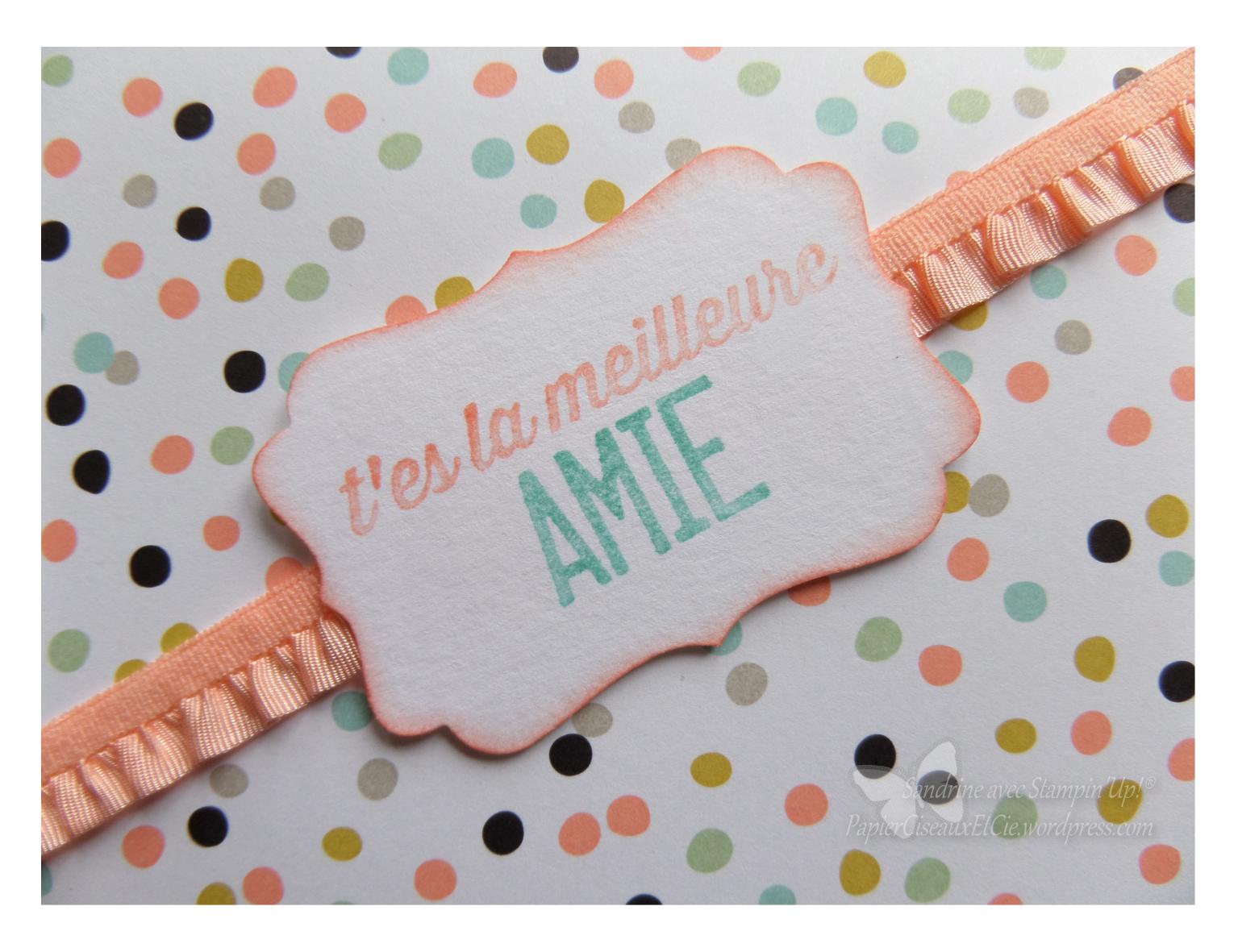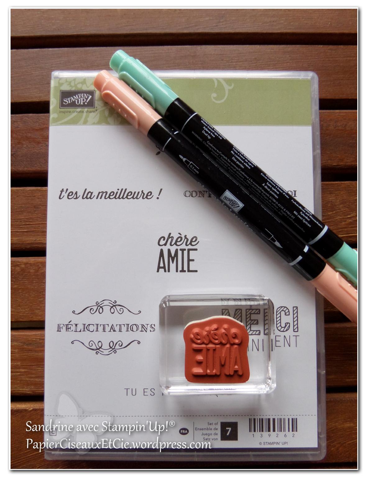 J’ai utilisé les feutres SU (les Stampin’Write) pour sélectionner le mot que je souhaitais du tampon « Chère Amie » (la technique se trouve >ICI< ):