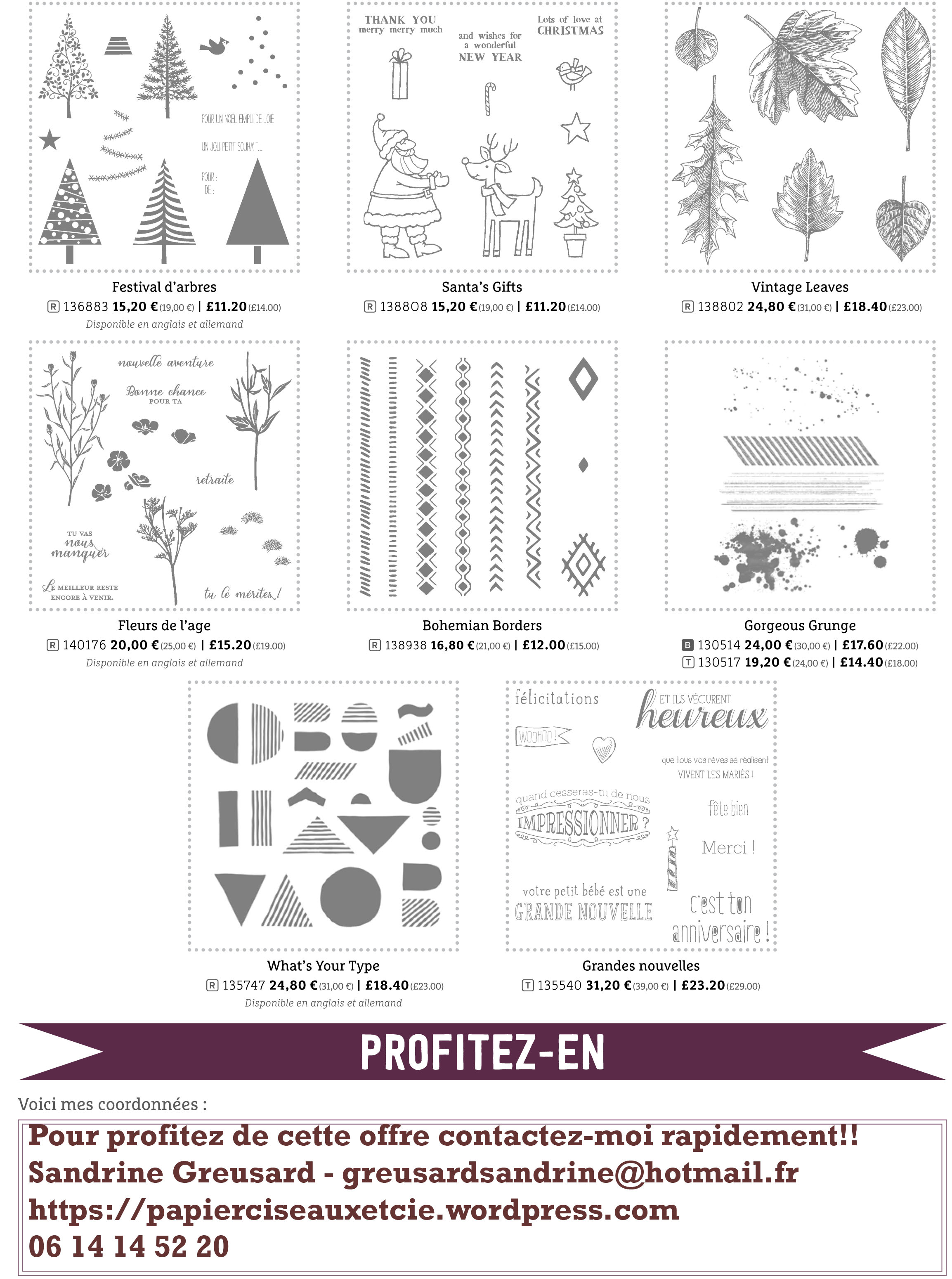 - La remise de 20 % concerne uniquement une sélection de tampons (téléchargez la liste de produits en PDF, ci-dessus).