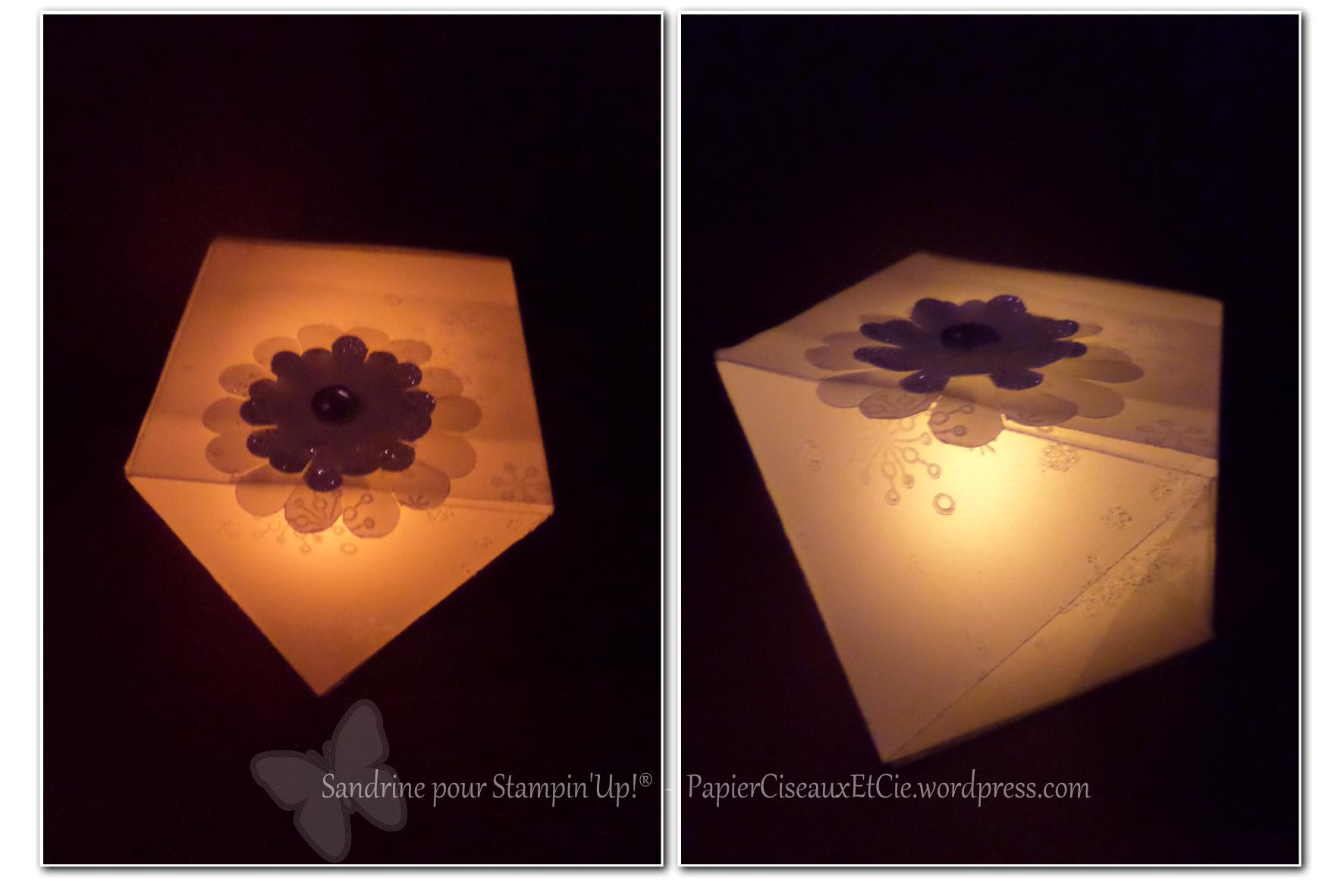 Il suffit de mettre un bougie chauffe-plat à pile à l’intérieur et voilà le résultat: