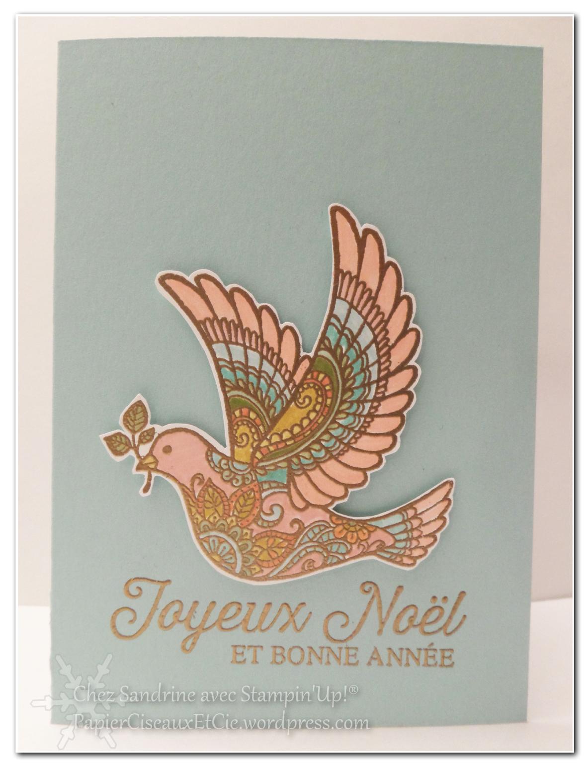Et bien sûr toujours un peu de relief, j’ai découpée la colombe et l’ai collé avec les stampin dimensionnal (mousse 3D):