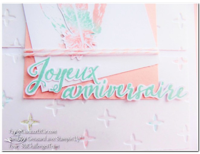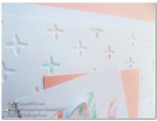 J’ai teinté quelques étincelles du plioir lors de l’embossage à froid, ainsi on devine plus la couleur que l’on ne la voit et j’ai rajouté une troisème couleur Riche raisin pour casser la « monotonie » du rose et bleu: