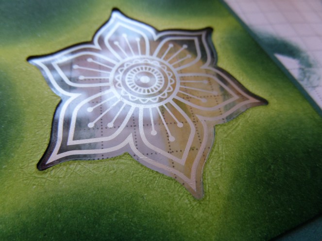 Décorez le papier blanc (même technique) et collez le au dos sur le sticker côté argenté
