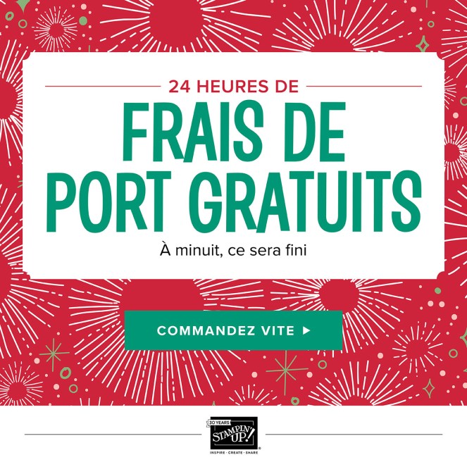 Une dernière offre emballante pour vos cadeaux de fin d’année ou pour vous faire plaisir avant le temps des Fêtes. Stampin’Up!® offre les frais de port gratuits pour 24 heures seulement. Jusqu’à minuit, cette offre s’applique à TOUTES les commandes Stampin’ Up! (vos commandes personnelles comme les commandes d’atelier)