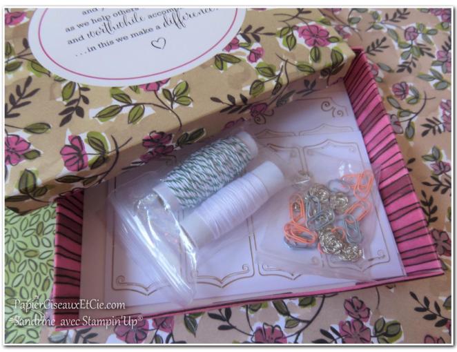 qui contient des étiquettes de différentes tailles, de la ficelle à rôti bicolore, du fil nacré, des roses argentés autocollantes et des trombonnes en deux teintes!!!