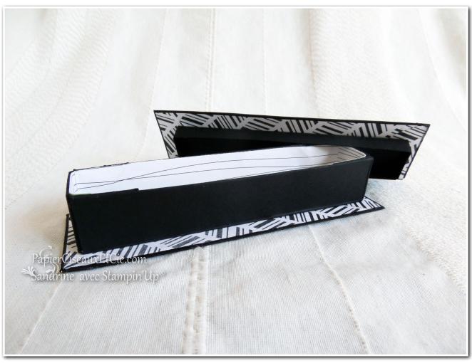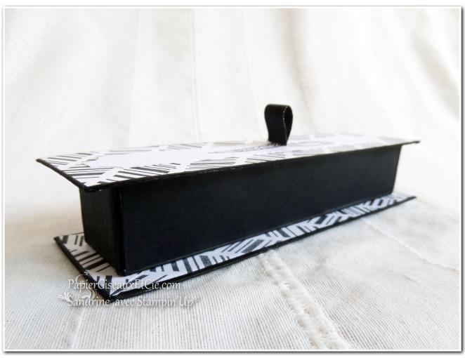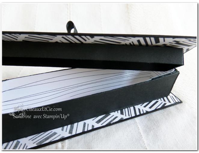 Sandrine, ta réa est tout simplement magnifique. J’aime son côté très chic et épuré, dû à la fois au choix du papier et aux débords du socle et du couvercle. Une réussite totale. Bravo, bravo! Bises