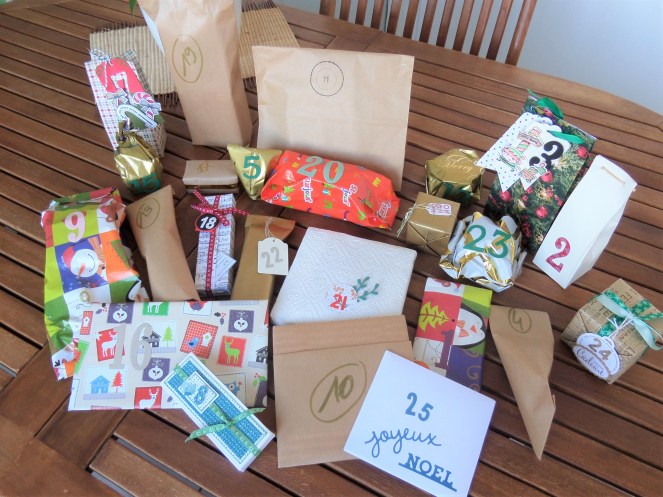Comme nous étions six, nous avons décidé de créer chacune 4 cadeaux pour avoir nos 24 cases du calendrier de l’avent 🙂