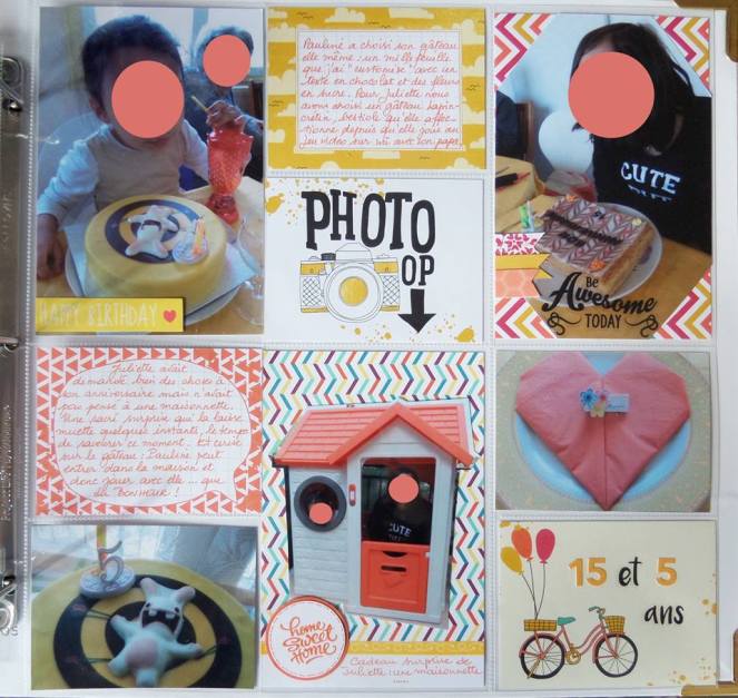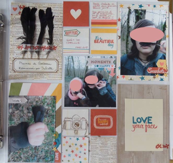 Voici quelques exemples de pages de PL que j’ai faites en grands formats, il s’agit du choix de mes filles donc forcément des pages de balades en forêts et d’anniversaires 😛