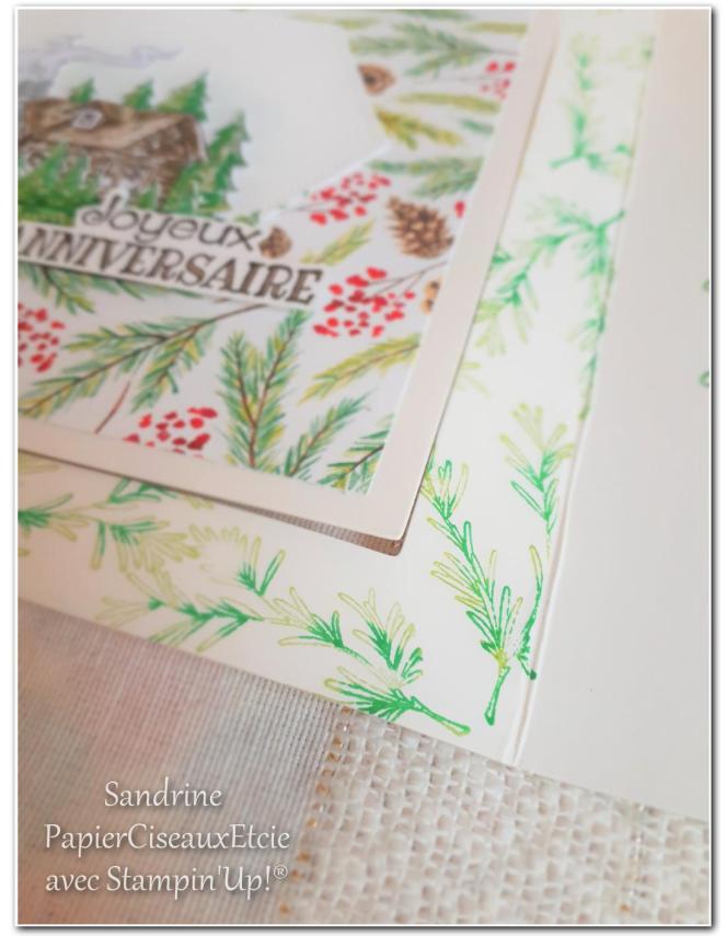 J’ai décoré ma carte avec une branche du même set de tampons en deux teintes de verts pour rappeler le papier et parce que nos sapins ont encore la pointe de leurs branches plus claires 😉