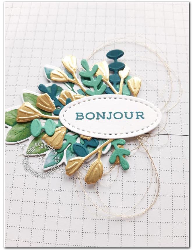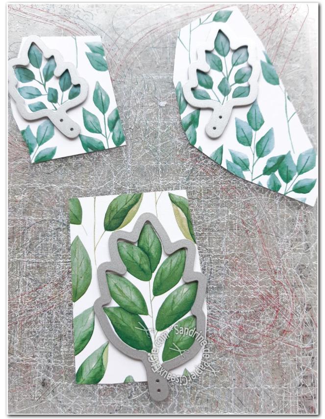 Pour le bel embellissement du devant, j’ai choisi d’assembler des éléments feuillages et des éléments du papier imprimé dont les découpes sont coordonnées!!
