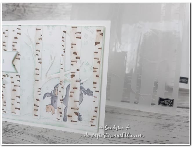 Notre bourriquet joue à cache-cache derrière les arbres dans les bois, sous la neige (les flocons sont issus du set de tampons « gentils bourriquets »)