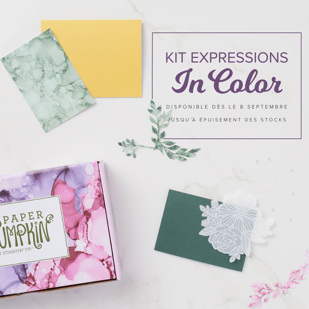 Le kit Paper Pumpkin Expressions In Color vous permettra de découvrir et d’explorer nos collections In Color 2020-2022 et 2021-2023. Éclaboussez le monde de votre style grâce à des créations artistiques aux motifs de taches d’encre ! Ce kit unique en son genre sera vendu dans tous nos marchés à compter d’aujourd’hui. Mais ne perdez pas une seconde ! Il sera seulement disponible jusqu’à l’épuisement des stocks…