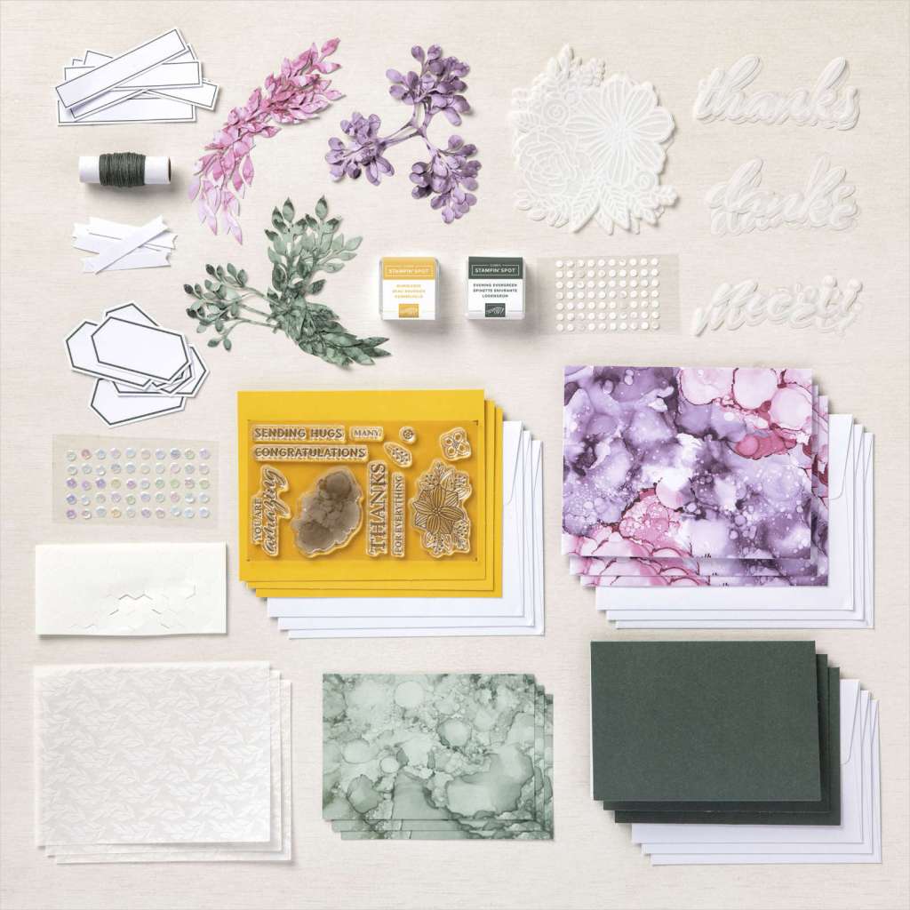 Ce kit incroyable contient suffisamment de matériel pour créer neuf cartes et les enveloppes coordonnées, y compris des papiers aux motifs de taches d’encre, un set de tampons exclusif et pas un mais deux mini-tampons encreurs Stampin’ Spots ! Et, tout est livré dans une adorable boîte colorée à collectionner.