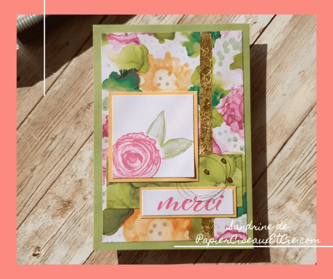 Il s’agit d’une carte pour toute simple réalisée avec les > papiers encre animée <, du papier Blanc simple, Riche raisin et Papaye pâle, quelques brillants autocollants et les tampons > Encre d’artiste < ☺️
