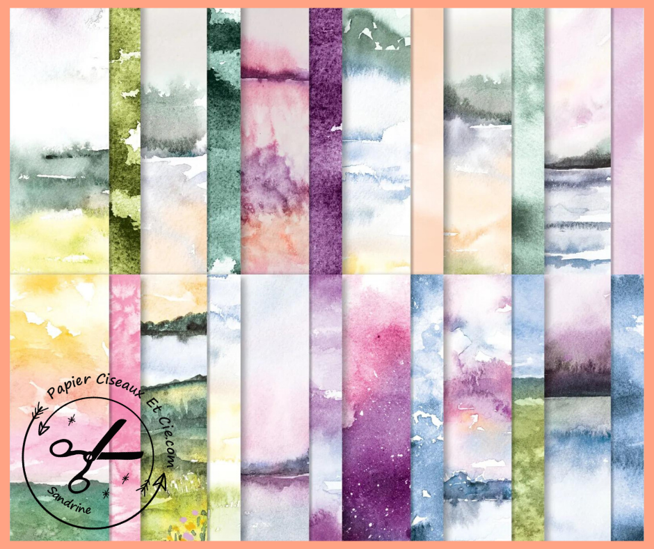 Voici un aperçu de ces superbes papiers imprimés façon aquarelle qui sont contenus dans le kit: