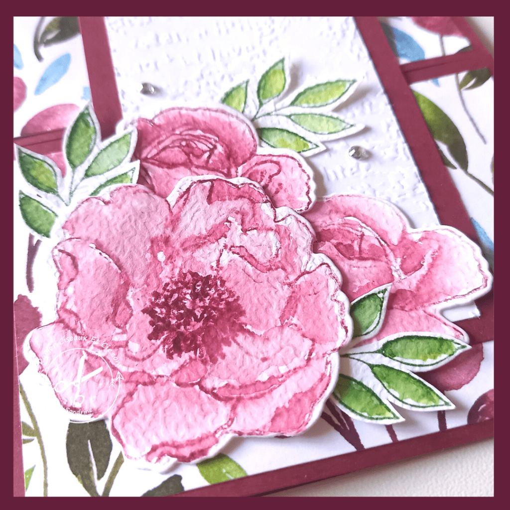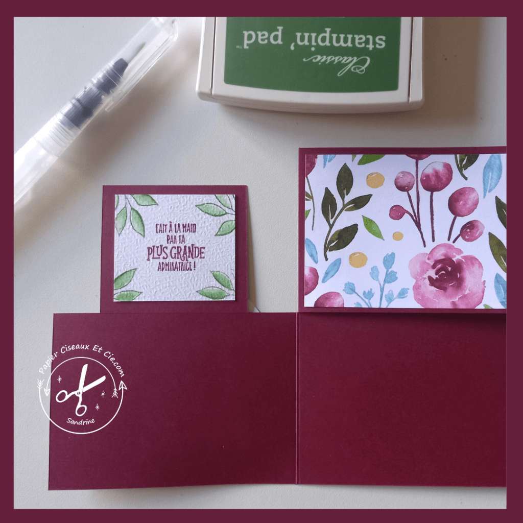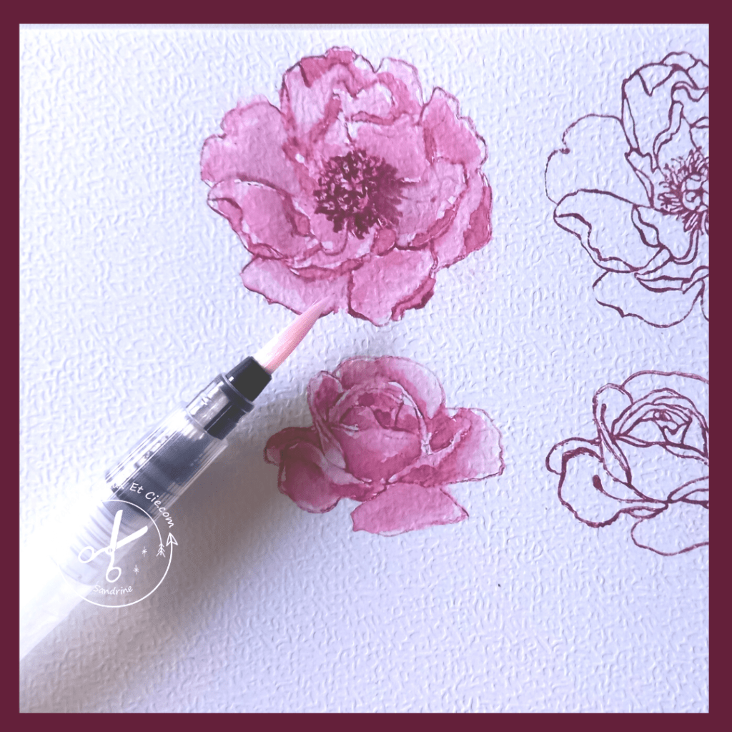 Créez votre embellissement à l’aquarelle, pour ma carte j’ai choisi des fleurs et du feuilllage. Vous choisirez les motifs que vous souhaité 😉