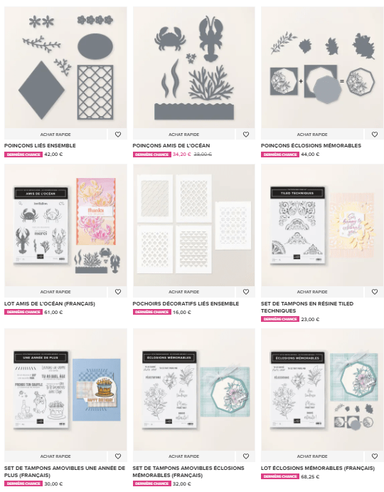 Pourquoi ? parce que la section « Dernière chance » vous permet d’acquérir les anciens modèles et très souvent à prix réduits! Cette section est accessible tout au long de l’année, vous pourrez y faire vos emplettes créatives sans contrainte de calendrier (jusqu’à épuisement des stocks)!